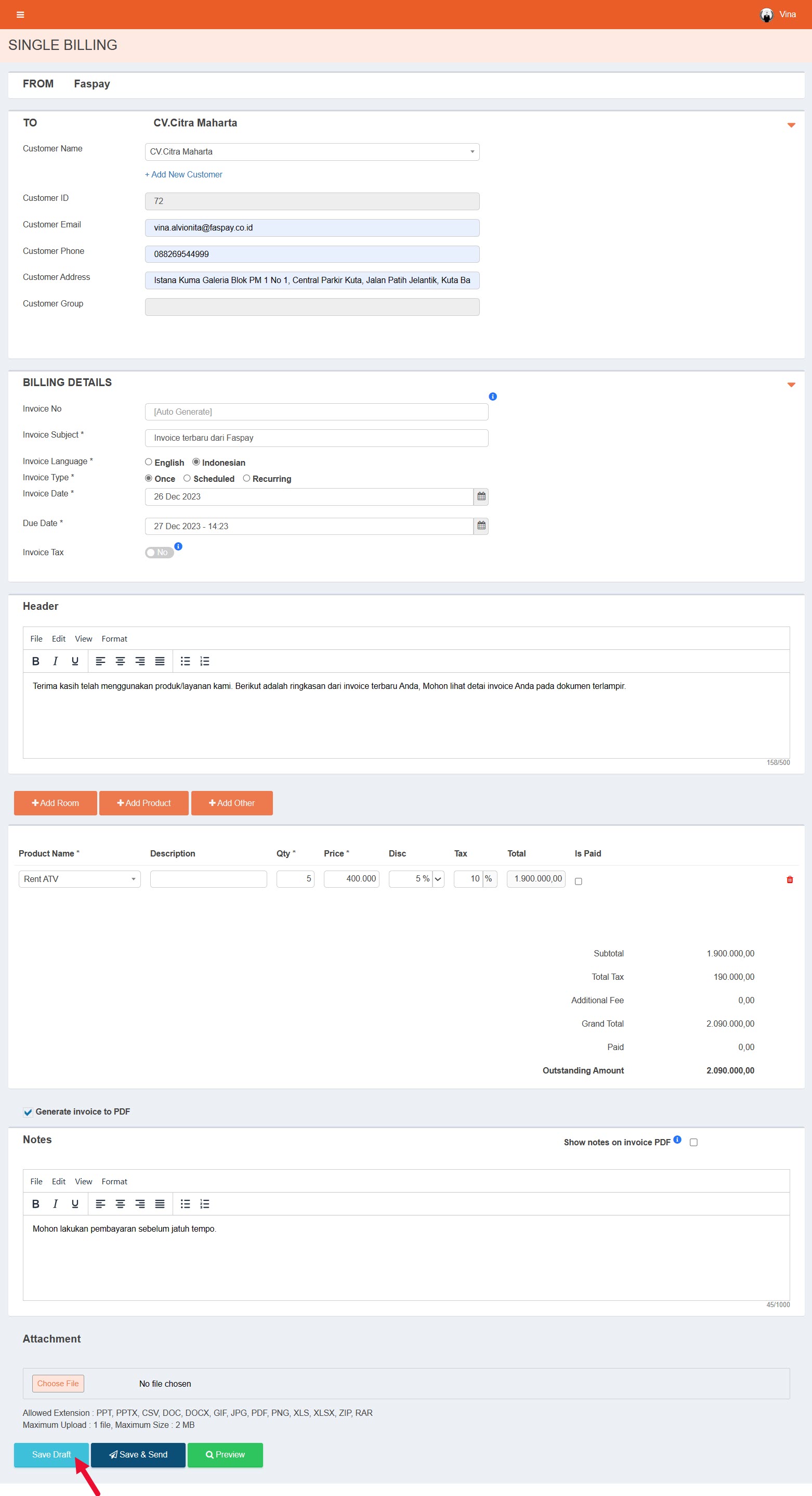 Save Draft is a feature used to create invoice, if the input data still require confirmation/change then it can be saved temporarily (Save Draft). The following steps explain how to saving a temporary invoice (Save Draft):