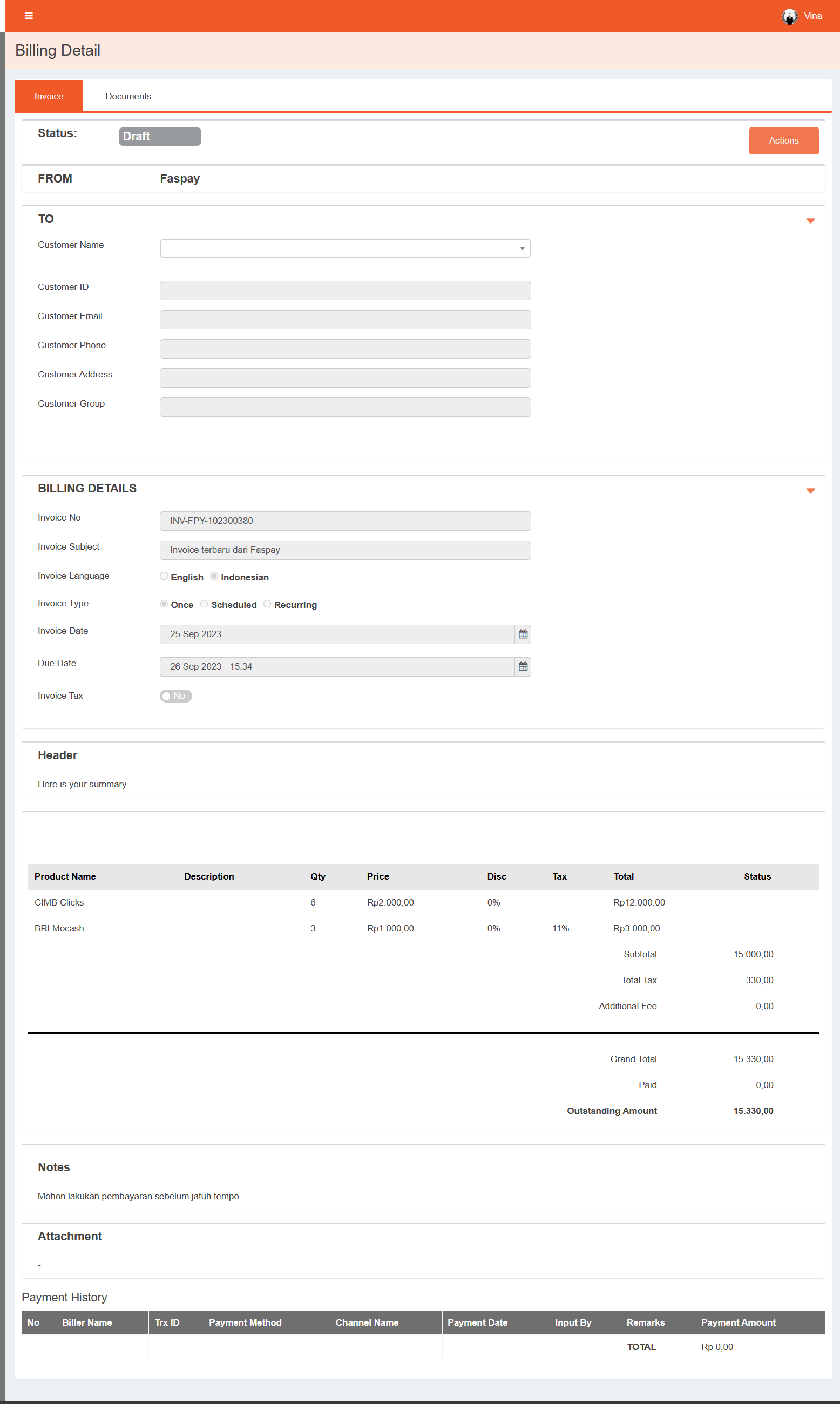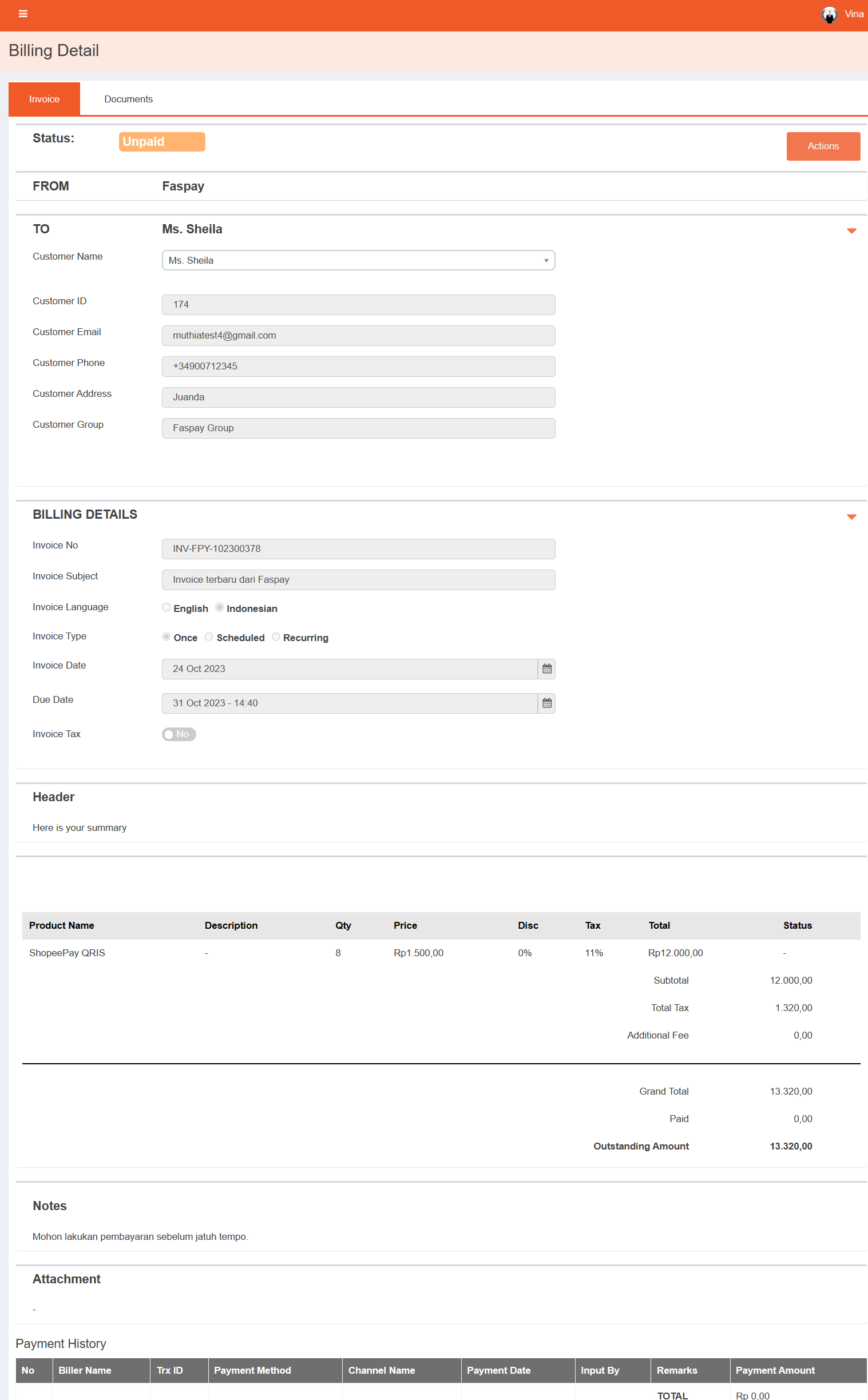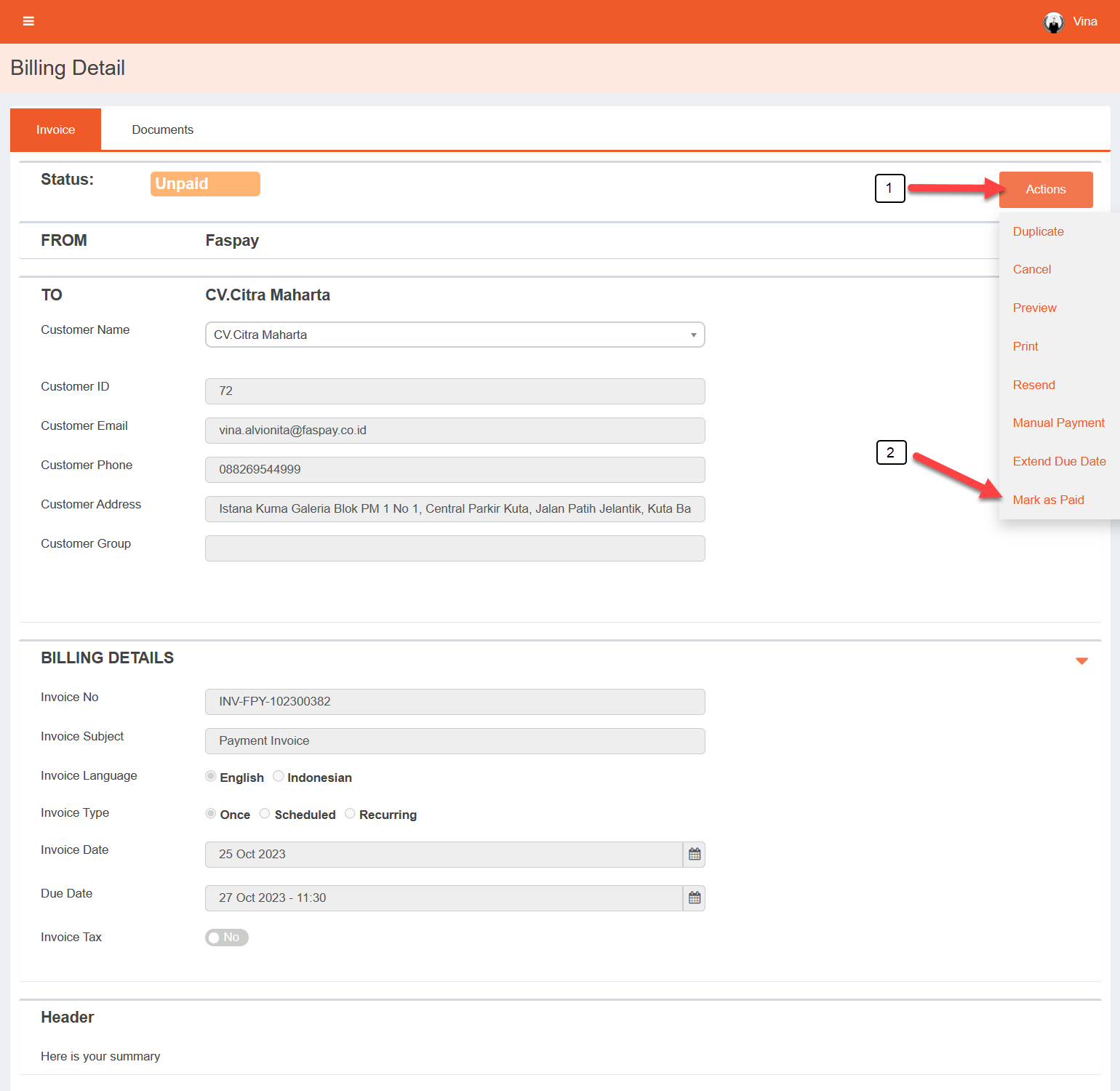This feature is used to record offline payments that merchants receive from customers. So, the payment history will be recorded in Faspay Billing Systems. This feature is accessible from **Billings → Detail Invoice → Actions Menu → Manual Payment** and available to the invoice with Unpaid, Partially Paid, or Overdue status.