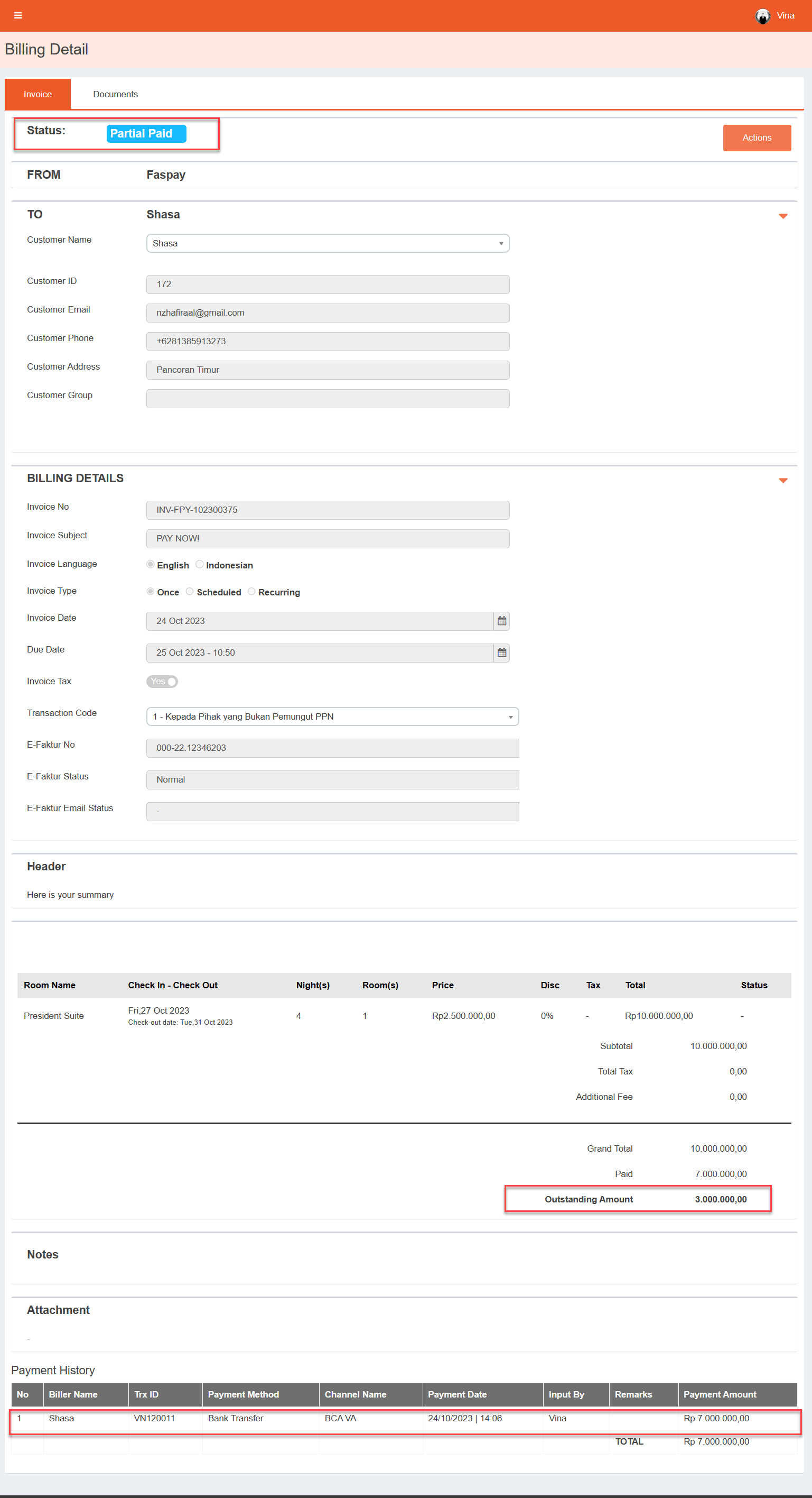 4. After submission success, the invoice status will be updated to **"Partial Paid"** or **"Paid"** and a record of the manual payment, including the user's information who made the payment, will be added to the system's payment history.