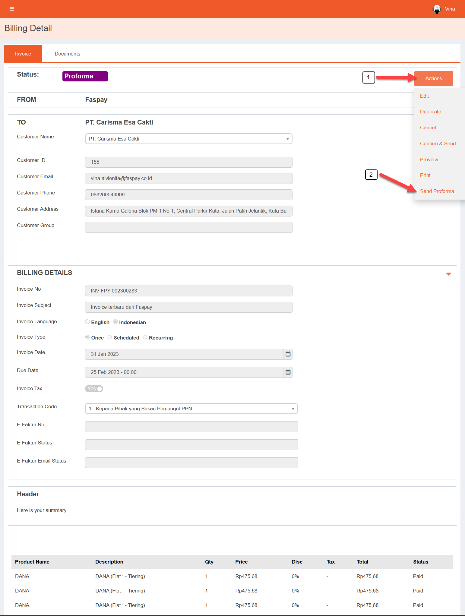 Send Proforma Invoice can only be used if the merchant activates the Proforma Invoice setting. This feature can be done on invoices that have the status "**Draft/Proforma**". The following steps explain how to send proforma: