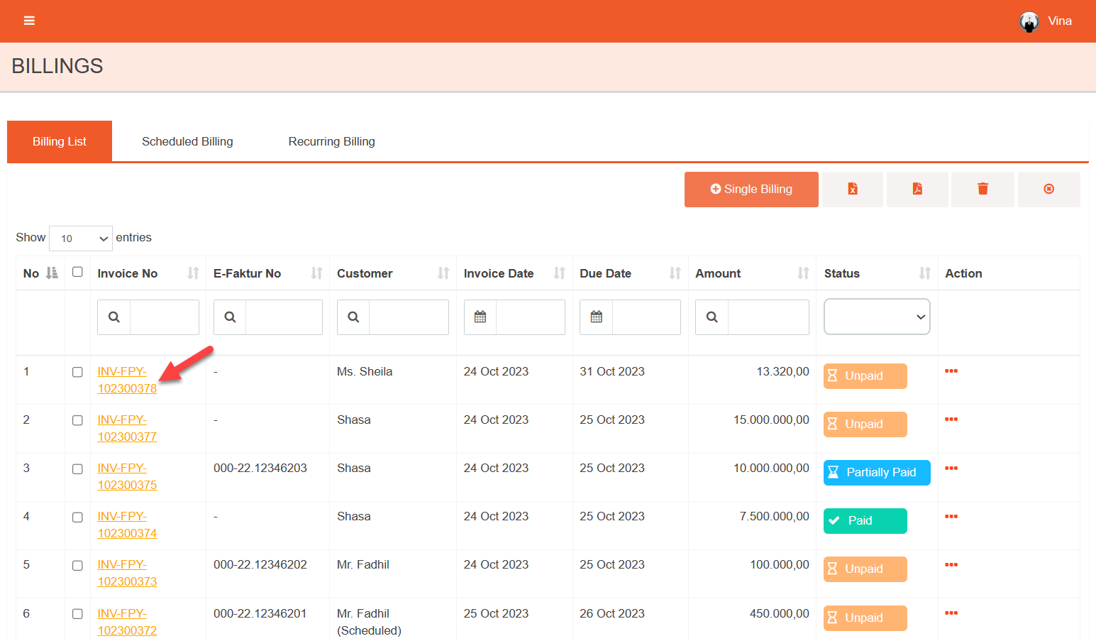 1. Open the details of the billings, for example, click the detail on the billings with **Unpaid status**.