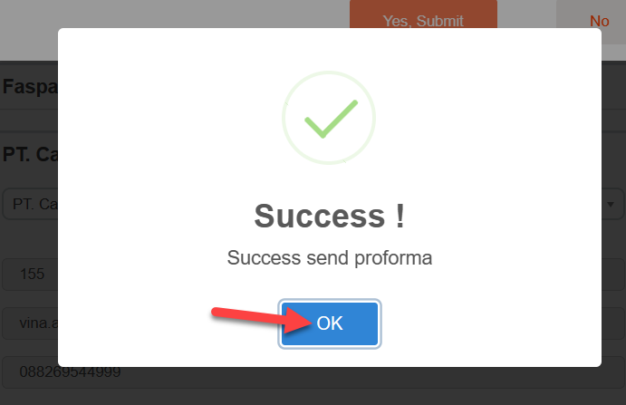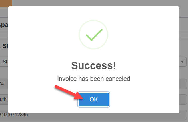 3. After successfully confirming & sending an invoice, on the success notification pop-up click the "**OK**" button.