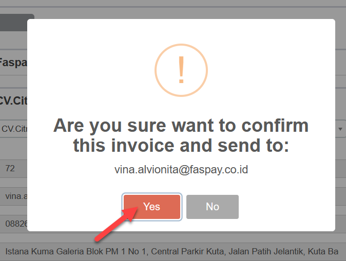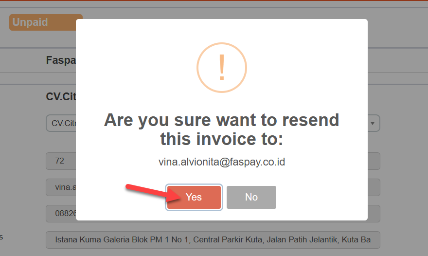 2. On the confirmation pop-up, click the "**Yes"** button to resend the invoice to the email address that has been registered.