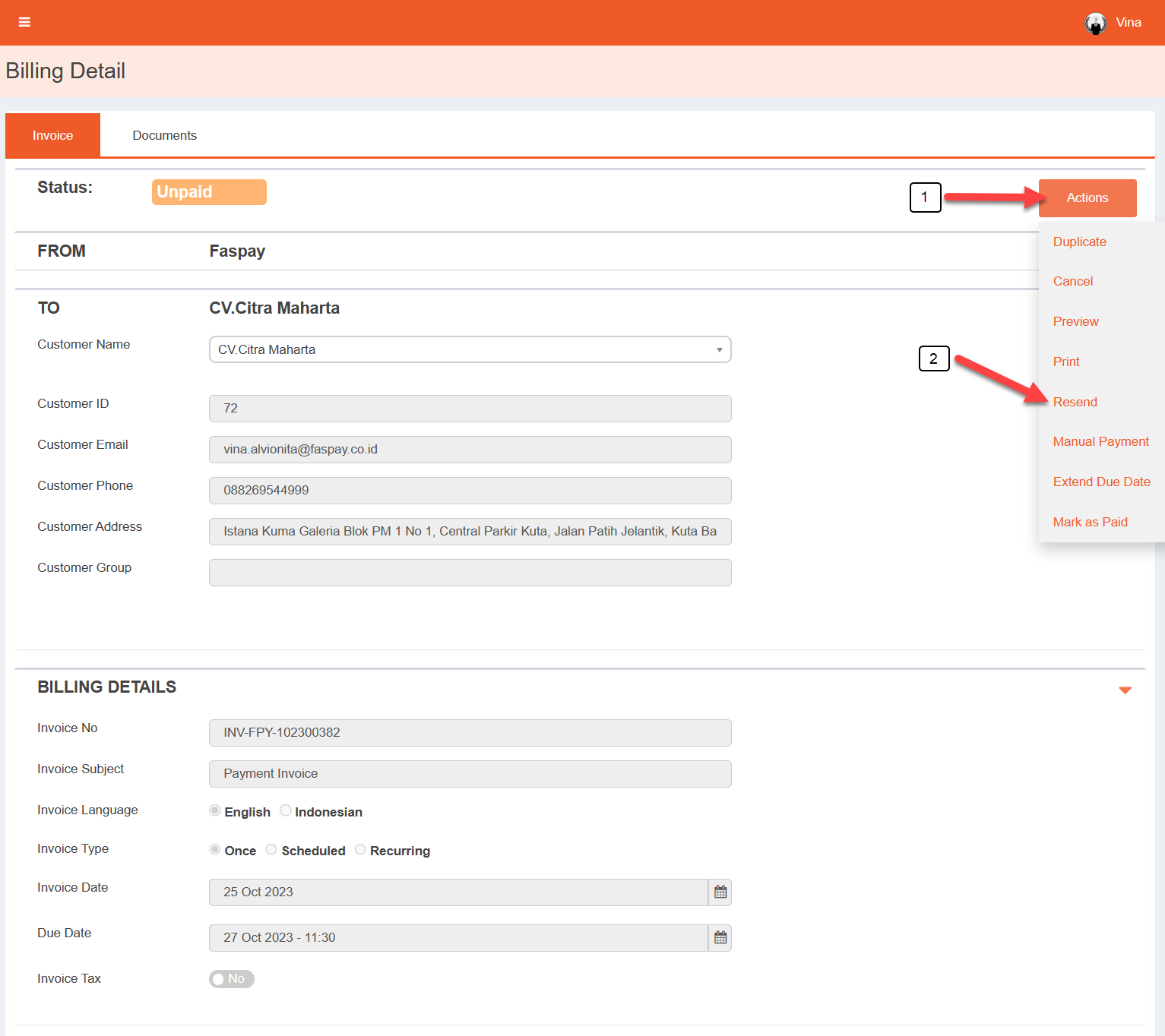 Resend Invoices can only be done for invoices with the status "**Unpaid, Partially Paid**, and **Overdue**". This feature is used to resend invoices to customers via e-mail. The following steps explain how to resend the invoice to the customer e-mail: