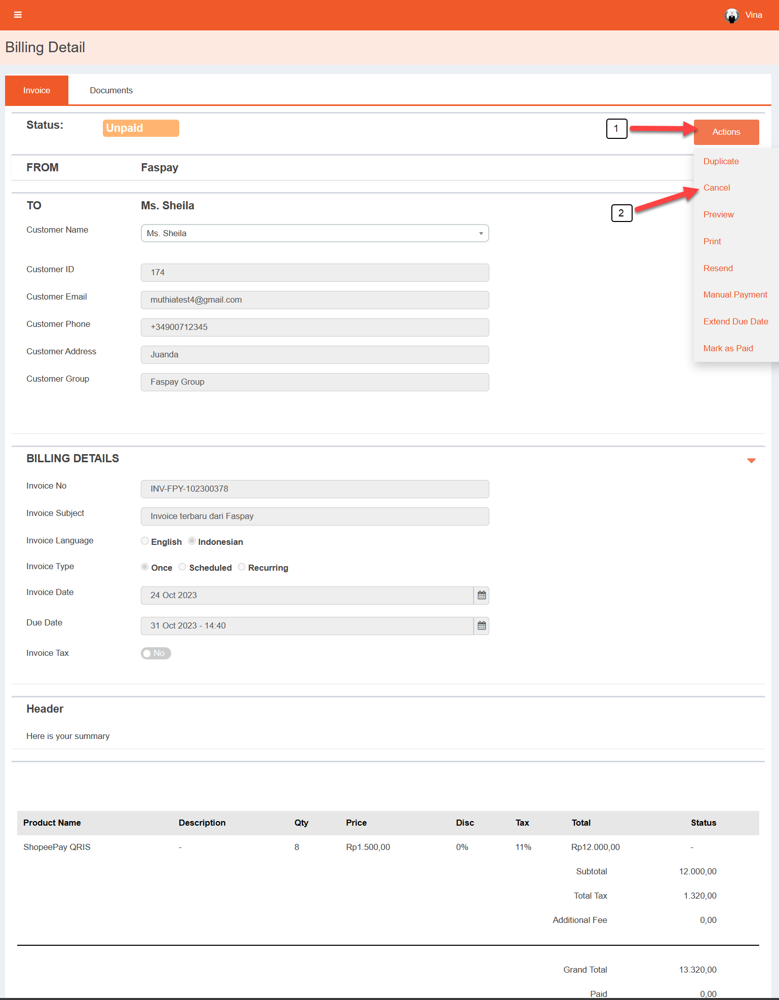 1. Select the invoice file on the Billing List page, then display the invoice detail. Click the "**Actions**" button, then click “**Cancel**”.