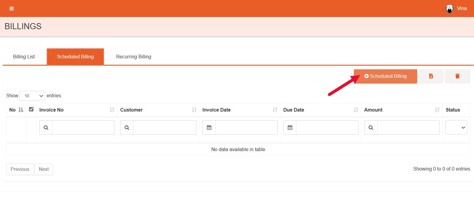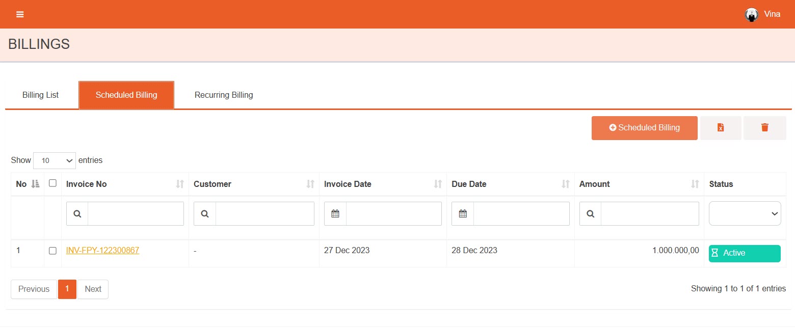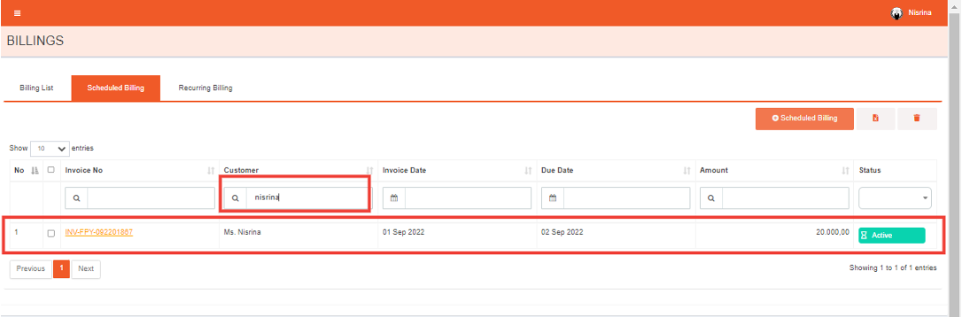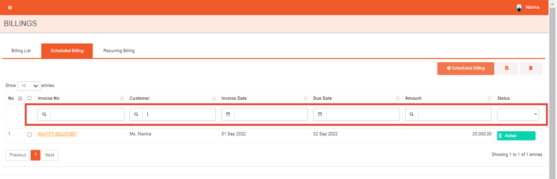 1. On the Scheduled Billing page to search data, it can be done by inputting the invoice data keyword in the search field.