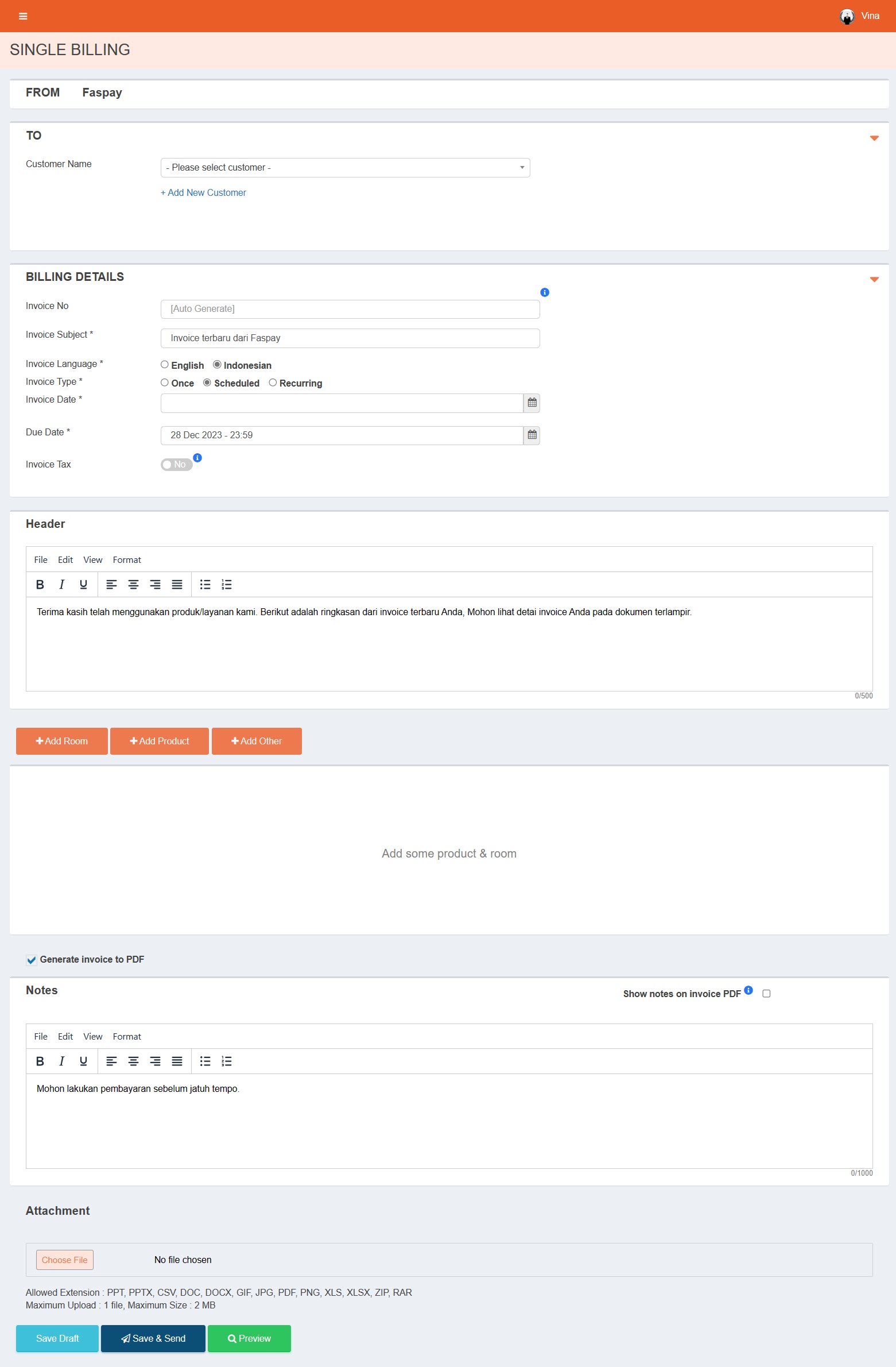 <table><thead><tr><th width="258">Field</th><th>Description</th></tr></thead><tbody><tr><td>To</td><td>Customer data</td></tr><tr><td>    Customer Name</td><td>Customer name (registered)</td></tr><tr><td>    Add New Customer</td><td>Add new customer data</td></tr><tr><td>Billing Details</td><td>Complete billing data</td></tr><tr><td>    Invoice No</td><td>Invoice number (auto generate)</td></tr><tr><td>    Invoice Subject</td><td>Invoice subject</td></tr><tr><td>    Invoice Language</td><td>Language used on the invoice</td></tr><tr><td>    Invoice Type</td><td>Invoice type (choose as needed)</td></tr><tr><td>    Invoice Date</td><td>Date the invoice was created</td></tr><tr><td>    Due Date</td><td>Payment limit/due invoice created</td></tr><tr><td>    Invoice Tax</td><td><p>Will appear if customer enable E-Faktur module.</p><p>If you activated the invoice tax, when system changes proforma to invoice, the system will automatically generate the tax invoice number for the invoice with the following conditions:</p><ul><li>The tax invoice number is taken from the range of tax invoice available numbers on the E-Faktur No page.</li><li>The system will use the tax invoice number sequentially from smallest to largest (Ascending order).</li><li>The period of the tax invoice number that was used must be the same as the current year(Year Period)</li></ul></td></tr><tr><td>     Transaction code</td><td><p>List of transaction code (will appear if customer activated Invoice Tax).</p><p>01: To Parties Who Are Not VAT Witholder</p><p>02: To the Treasurer's Witholder</p><p>03: To the Witholder except Treasurer's</p><p>04: DPP Other Values</p><p>06: Other submissions, including submission to foreign tourists in the context of VAT refunds</p><p>07: Submission of which VAT is not collected</p><p>08: Submission of VAT Exemption</p><p>09: Delivery of Assets (clause 16D of the VAT Law)</p></td></tr><tr><td>Header</td><td>Email header text</td></tr><tr><td>     Add Room</td><td>Choice of invoice type item type "room"</td></tr><tr><td>     Add Product</td><td>Choice of invoice type item type "product"</td></tr><tr><td>     Add Other</td><td>Choice of invoice types other than room &#x26; product</td></tr><tr><td>Generate Invoice to PDF</td><td>Information for generating invoices to PDF format</td></tr><tr><td>Notes</td><td>To add a note</td></tr><tr><td>Attachment</td><td>To attach a document</td></tr><tr><td>Button Option</td><td><ul><li>Click <strong>"Save Draft"</strong> to save the data temporarily.</li><li>Click <strong>"Save &#x26; Send"</strong> to save and send a new invoice.</li><li>Click <strong>"Preview"</strong> to preview the invoice before it is submitted.</li></ul></td></tr></tbody></table>