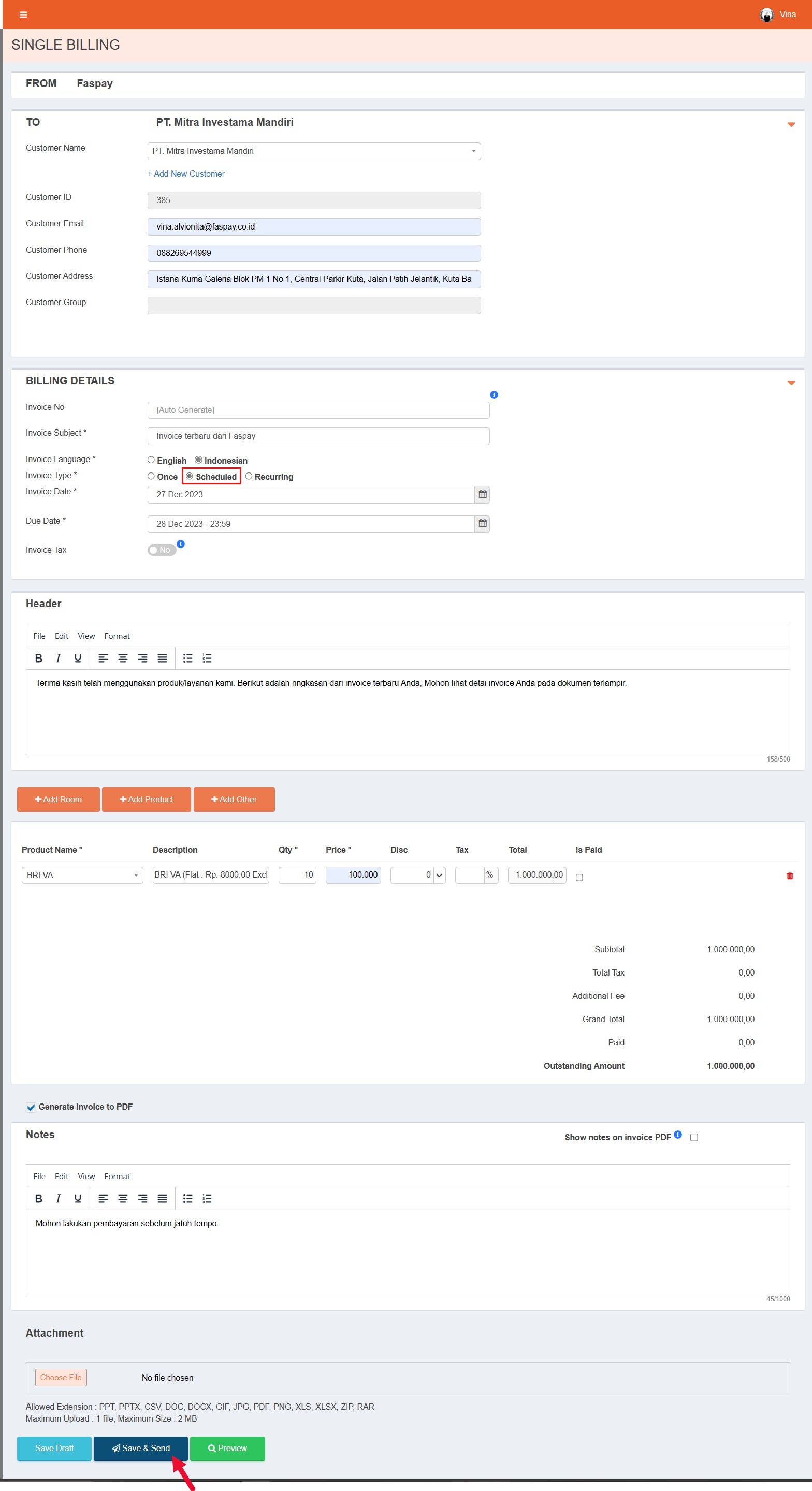Scheduled Billing is one type of invoice from single billing. Scheduled Billing is used to schedule the delivery of invoices to customers.