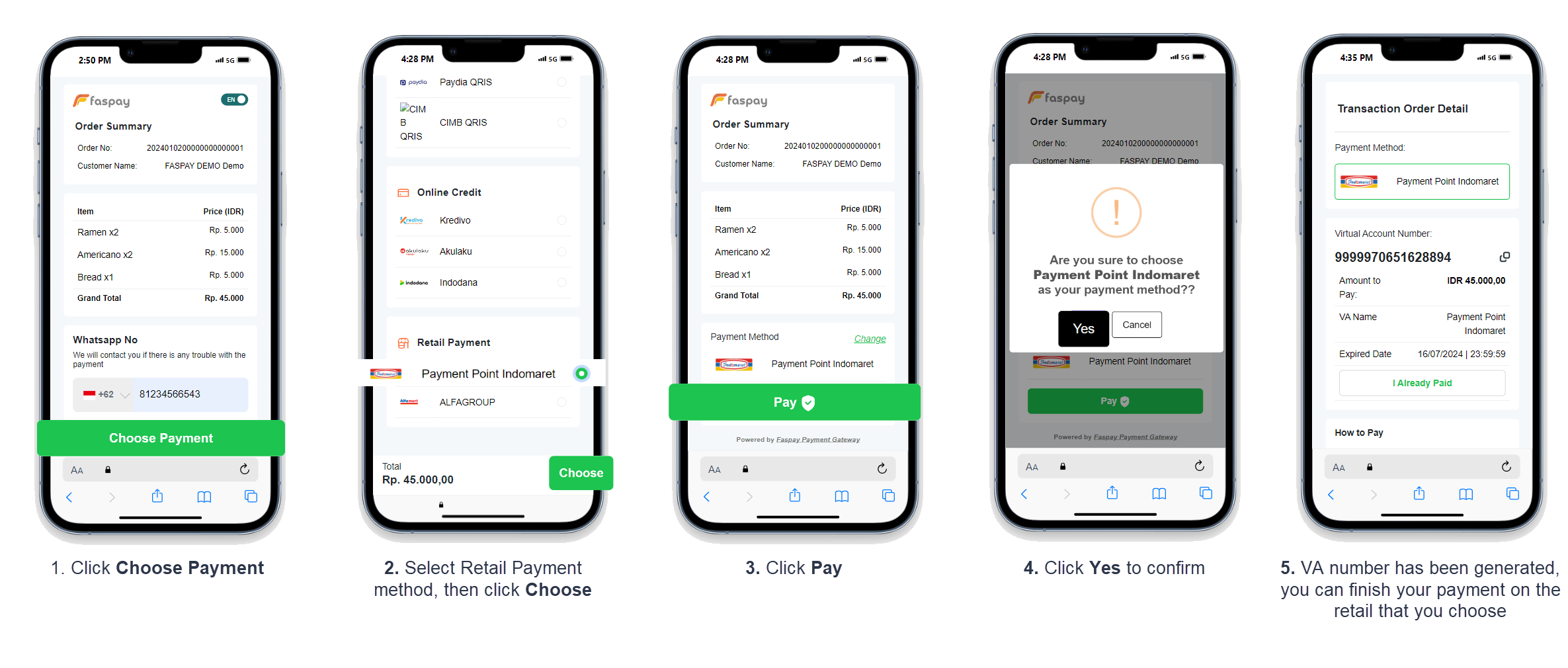 5. On your Transaction Order Detail use the VA number to finish your payment on retail that chosen. Quick guide to complete your payment accessible here. Then, check your payment status [here](https://docs.faspay.co.id/getting-started/faspay-xpress/faspay-xpress-4.0/payment-status).