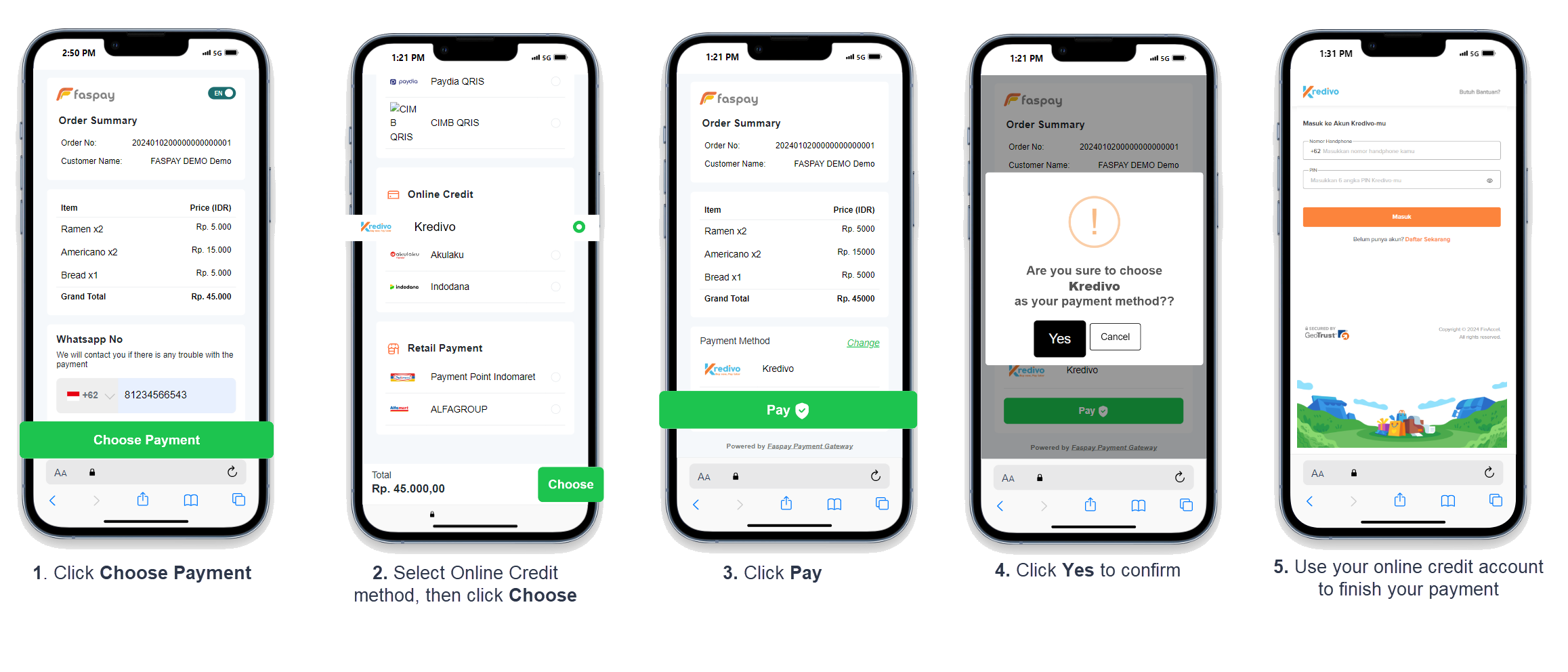 5. Finish your payment using your online credit account. Then, check your payment status [here](https://docs.faspay.co.id/getting-started/faspay-xpress/faspay-xpress-4.0/payment-status).