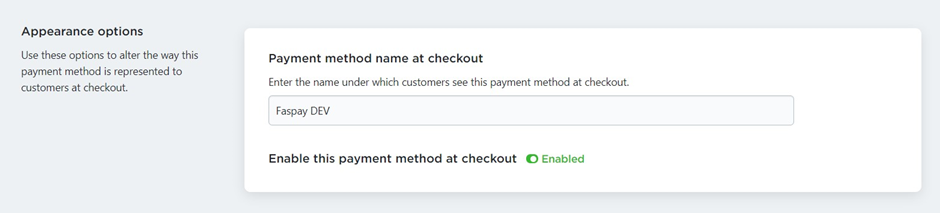 9. Then on **Appearance Options,** at **Payment method name at checkout**, You can filled with "**Faspay Payment Gateway"** or You can customize as Your needs.