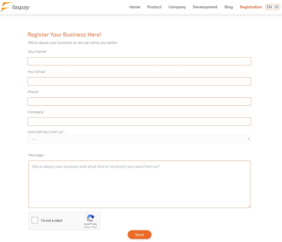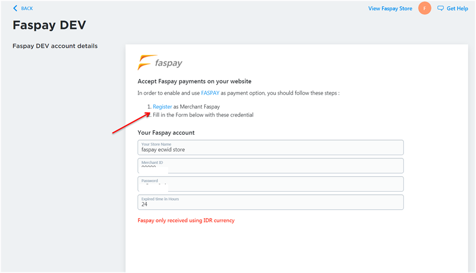 6. After selecting **"Faspay Payment Gateway"** You will be directed to the account details page. Before filling out the Faspay form, You must register by clicking **"Register".**